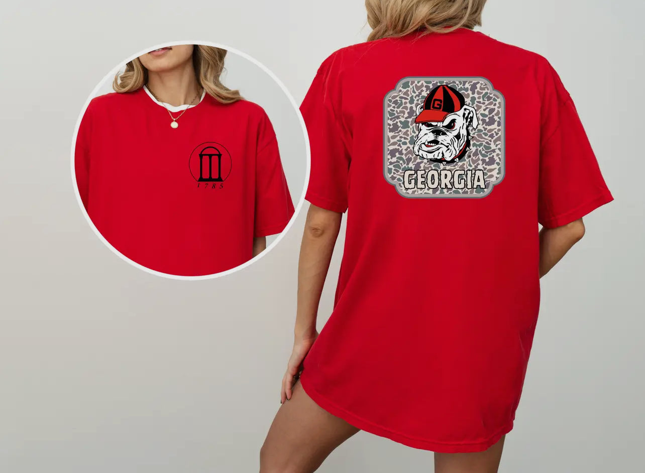 This garment, known as the UGA Arch SS Camo Tee, displays a design featuring the iconic arch of the University of Georgia.